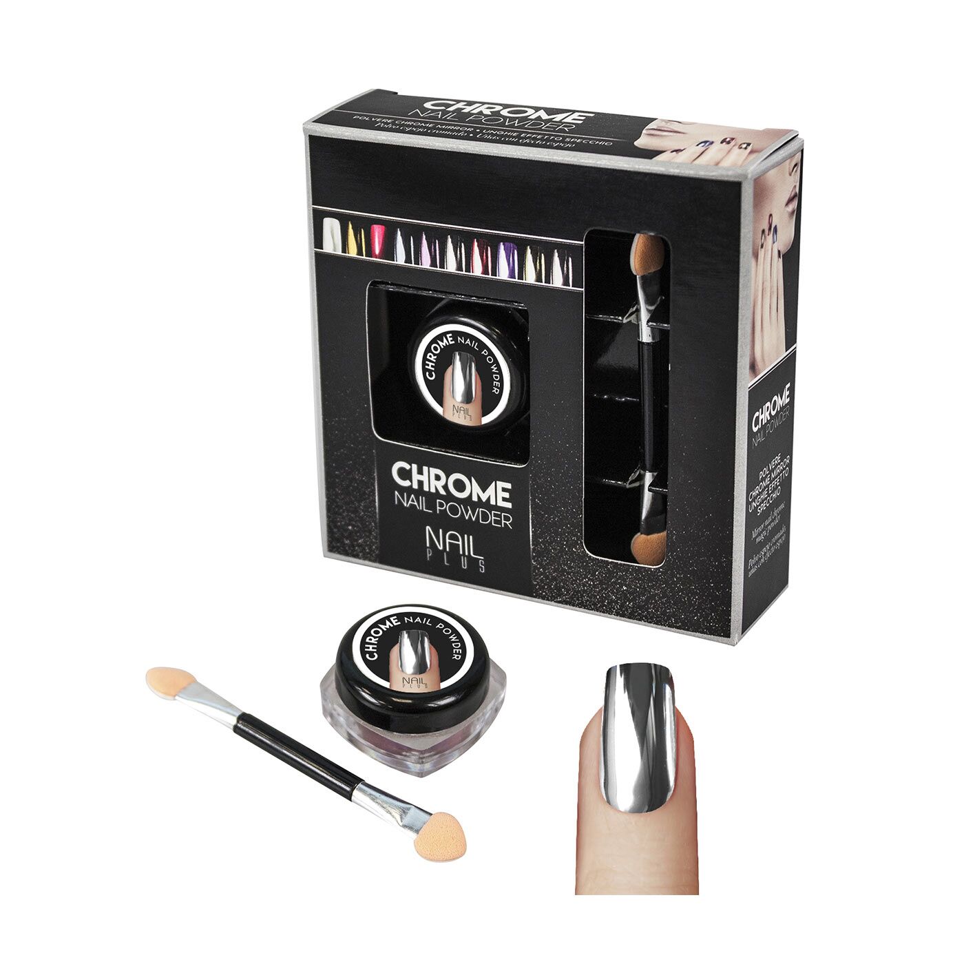 Stendere la polvere CHROME NAIL POWDER su tutta la superficie dell’unghia con l’apposito pennello