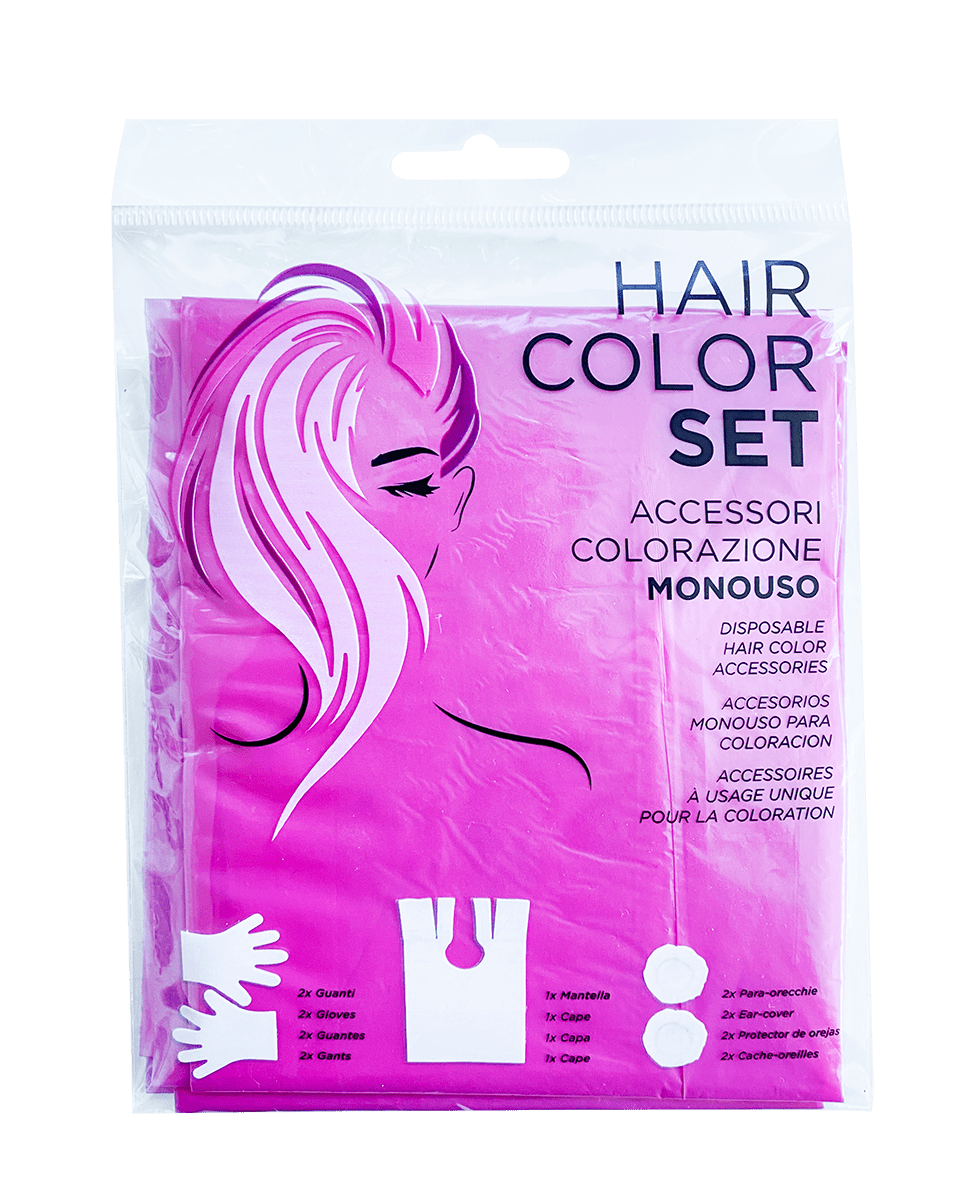 Accessori colorazione monouso. Il set comprende: 2 guanti, 1 mantella e 2 copri orecchie.